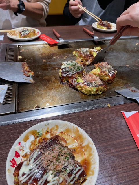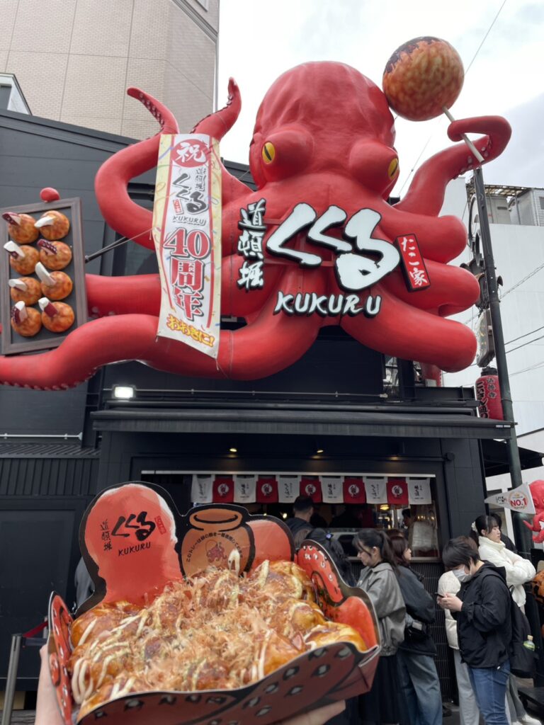 昼ご飯にラーメンを食べた後、隣にあったたこ焼きのお店「くくる」に並び、たこ焼きの本場の味と雰囲気を感じました。