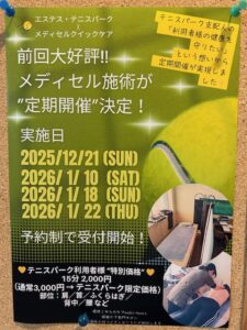 皆さま、こんばんは。 エステステニスパークの神山です。 強風、乾燥、指先ひび割れ注意報の1日いかがお過ごしでしょうか。 今年は例年より早めのヒートテックと手袋で冬将軍に備えます。 さて、先週実施された『メディセルクイック […]